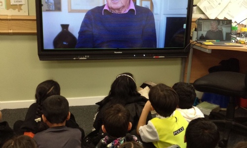 Year 1 children enjoying books and listening to the story of Elmer read by the author David McKee