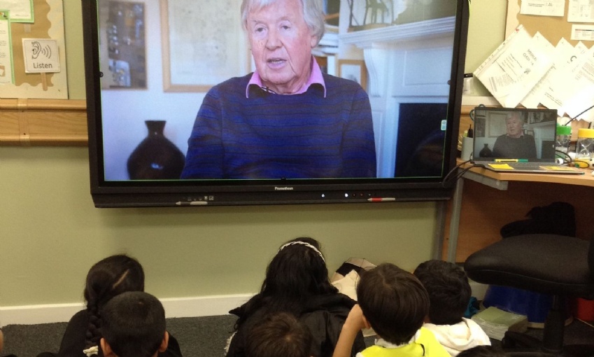 Year 1 children enjoying books and listening to the story of Elmer read by the author David McKee